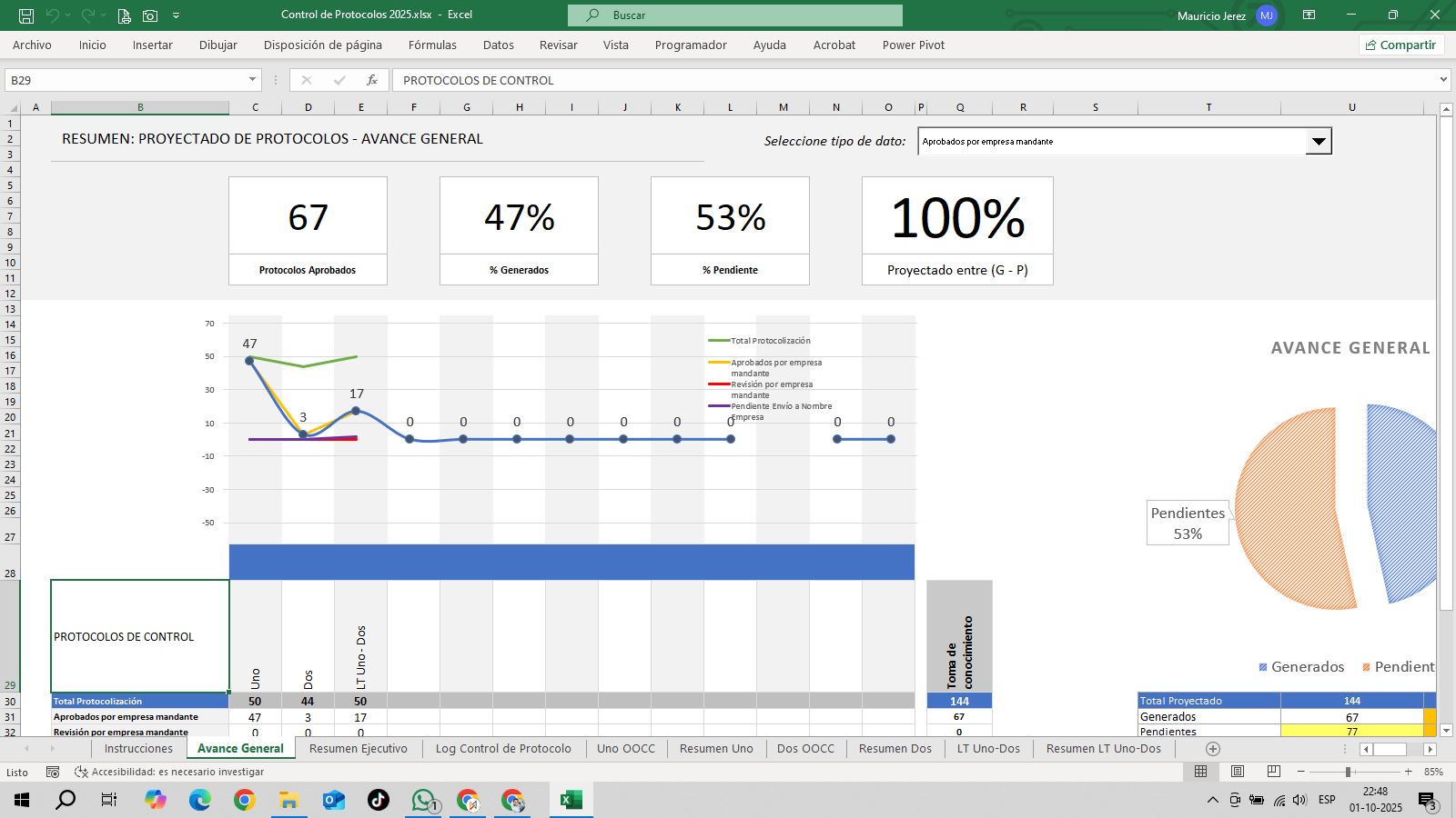 - Gráficos lineal que muestran el porcentaje de protocolos pagados y pendientes.